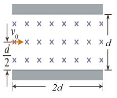 9.有一平行板電容器,內部為真空,兩個電極板的間距為d,每一個正方形電極板的長均為2d。電容器內沒有電場,只有垂直進入紙面的均勻磁場B。電子從電容器左端的正中央以初速V₀射入,其方向平行於電極板之一邊。電子的電荷以-e表示,質量以m表示,重力可不計。欲使電子不撞擊電極板,磁場B的大小有何限制?