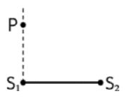 11.水波槽實驗中,兩同頻率且同相的點波源S₁、S₂,產生的水波波長為λ,兩者距離=5λ。水面上一點P與S₁的連線與垂直,則從S₁往P點方向前進,第3次碰到節點的位置,與S₁距離為何?