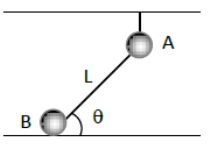 13.兩個完全相同的小鋼球A、B以一質量可忽略的均勻金屬桿連接在一起,兩球間的距離為L,球的半徑可忽略,起先將A球以細繩懸吊於空中,B球則靜置於光滑的水平面上,這時連桿與水平面的夾角為θ,今將細繩以火燒斷,當金屬桿的中心墜落至桌面(桿身視為平貼在桌面)時,試問此時A、B兩球瞬時速度各為多少?(A、B全對才給分)