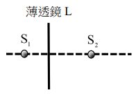 (2)兩個點光源S₁、S₂間的距離為24 cm,使用焦距為9 cm的薄透鏡L,垂直放置於兩點光源S₁、S₂的連線上並調整位置,使兩個點光源成像於同一位置,則兩點光源S₁、S₂到透鏡的距離比為何?