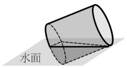 10. 有一底面半徑為 3 公分且密度不均勻的圓柱體,傾斜漂浮在靜止的水平面上,水面剛好通過底面直徑且與底面成 45°角,示意圖如右。 求此圓柱體在水面下的立體體積為____________立方公分。(圓周率=π)