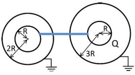 12.如圖,有共計四個金屬球殼,其中兩組外球殼均接地,而右側內球殼原本帶有 Q 的電量, 今天我們用一個導線將兩組內球殼相連,但不接觸到外球殼,求內球殼的電位?