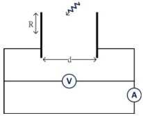 13.在光電效應實驗中,兩面金屬板半徑為 R,相距 d,且 R>d/2。已知截止電位為 V、電子質 量為 m,今想加入垂直紙面之磁場 B,讓安培計讀數為零,求 B 最小值。