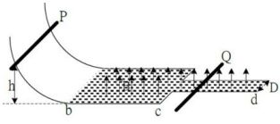 6.光滑平行金屬軌道如圖所示,軌道水平部分(灰色區域)外加一鉛直向上的均勻磁場 B,軌道由 b 處開始到 c 處寬度為 3D,c 到 d 處寬度為 D。假設軌道夠長,將兩根相同的金屬棒 P、 Q 分別擺放如圖所示的位置,P 棒比水平軌道處高 h,今自由釋放 P 棒使其沿軌道下滑,若 P 棒來到 c 處之前,Q 棒就已達終端速度。若重力加速度為 g,求 Q 棒的終端速度大小為何?
