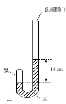 1. 如右圖之玻璃管,口徑為 0.50 公分,於 25℃,1 大氣壓時,已知左方玻璃管上方密閉空間中的氣體為氦氣,其體積為 5 毫升,此時左右玻璃管中之汞柱高度差為 14 公分。假設氦氣可視同理想氣體,今在右方開口處加入一些汞,使得最終左右汞柱高度差為 24 公分,試問此時氦氣的體積為若干毫升? (A)2.5 (B)3.5 (C)4.0 (D)4.5 (E)4.9