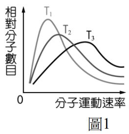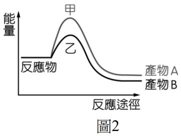 (A)反應物粒子只要有足夠的能量,反應就會發生 (B)某一級化學反應在經過一個半生期的時間時,其瞬時反應速率為初始反應速率的一半 (C)圖1為氣體分子運動速率與相對分子數目的分布關係,曲線代表某氣體三種不同溫度,則高低順序為T1>T2>T3 (D)圖2表示相同的反應物可經由不同反應途徑得到產物A與B。其中,路徑乙的活化能較路徑甲低,造成兩化學反應差異的原因必為有無添加催化劑 (E)氣態反應中,壓縮反應容器的體積造成濃度增加時,則反應速率必會增加。