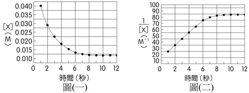 14. 王同學在 25℃及 1 大氣壓下,量測反應:X→2Y+Z 的反應速率。附圖(一)與(二)是反應進行中所量測到的反應物 X 的濃度與時間的關係。下列有關該反應的敘述,哪些正確? (A)此反應為化合反應 (B)此反應為零級反應 (C)反應物 X 的初始濃度為 0.067M (D)在反應過程中,反應物 X 分子之間必須互相碰撞,反應才會發生 (E)在反應後期,反應物 X 的濃度不再變化,是因為 X 停止反應所造成。