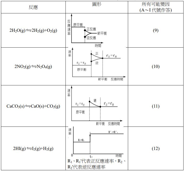 3. 對於一個平衡系統所施予的外加條件,以下列( A )~(I)為此題的操作考量範圍( A )加入反應物 ( B )加入生成物 ( C )壓縮體積 ( D )膨脹體積( E )定壓下加入 He (F)定容下加入 He (G)加熱 (H)降溫 (I)加入催化劑依圖中訊息,找出影響下列各平衡反應的所有可能變因 (以 A~I 代號作答)
