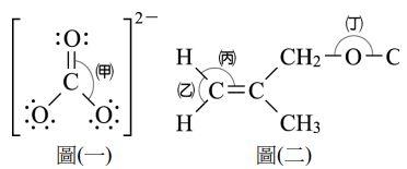 7. 試比較下列兩分子中(甲)~(丁)各個鍵角的大小順序,由大而小排列為 __(16)__。(以代號作答)