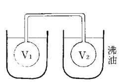 16. 兩體積相等之燒瓶用細管(體積忽略)相連通,最初在 27℃下兩容器共裝入 0.7 莫耳 H2,壓力為 0.5atm,今 V2 置入 127℃沸油中,而 V1 仍 27℃,平衡後之壓力為若干 atm?(以最簡分數作答)(2分)