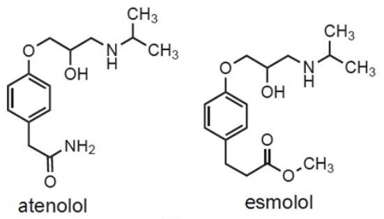 (A)atenolol 是β1-selective blocker (B)propranolol 為 non-selective blocker (C)esmolol 是前驅藥(prodrug),需經 esterase 水解才有活性 (D)三者中以 propranolol 親脂性最高,最易進入 CNS