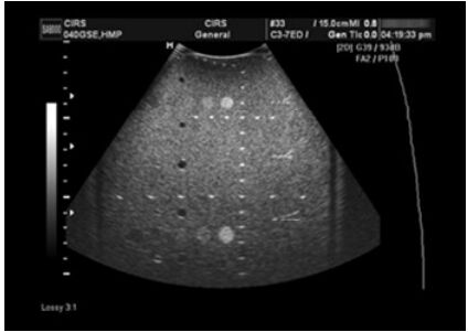 25.在超音波影像品質分析中,使用組織等效假體或是測試體(test objects)獲得如圖假體影像,下列何項不是此測試體主要分析之影像參數?