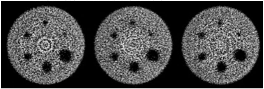 (A)投影角度不足 (B)不均勻度問題 (C)衰減修正異常 (D)影像重建套用錯誤濾波器