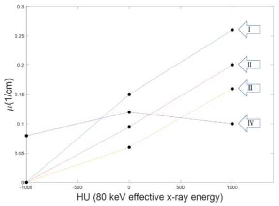 71.SPECT/CT 中,利用 CT 穿透式掃描進行衰減校正,下列四條校正曲線何者最符合使用?