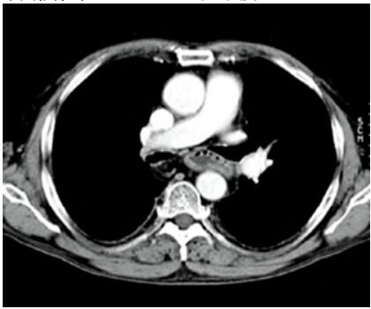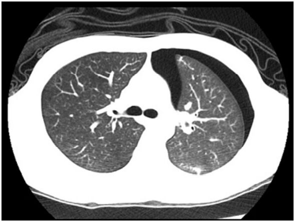 38.男性患者突然左胸痛,未施打顯影劑的胸腔電腦斷層在左肺旁發現異常(如下圖所示),最適當的診斷為 何?