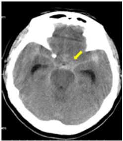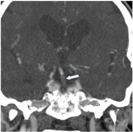 58.60 歲男性,臨床表現為言語困難和步態不穩。下圖 CTA 影像中箭頭所指為何種狀況?