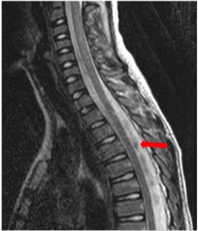 (A)腦脊髓液流動假影(CSF flow artifact) (B)脊髓動靜脈畸形(spinal arteriovenous malformation) (C)脊髓內出血(spinal intramedullary hemorrhage) (D)化膿性膿腫(pyogenic abscess)