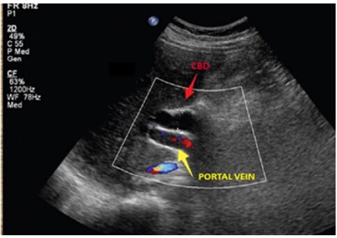 67.超音波掃描膽道時,出現如下圖雙管獵槍的特徵(double barrel shotgun sign),其最有可能的診斷為下列何者?