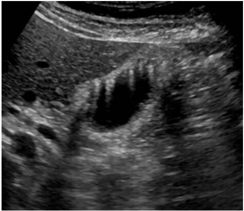 63.下圖為右上腹部超音波影像,其最可能的診斷為下列何者?