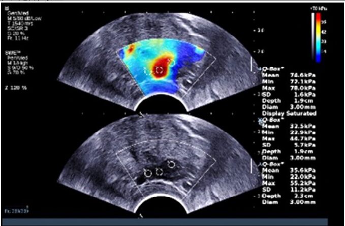 70.經直腸前列腺超音波呈現低回音病兆在左後 peripheral zone,下圖 color map 及定量測量(以 kPa 為單位)是何種檢查?