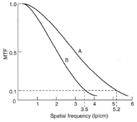 (A)電腦斷層中常用此參數描述其空間解析度 (B)MTF 和影像中之點擴散函數(point spread function, PSF)互為傅立葉轉換關係 (C)頻率響應(frequency response)會隨著頻率越高而降低 (D)由圖可知系統 B 的空間解析度優於系統 A