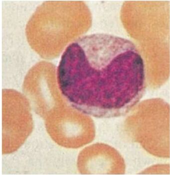 16.周邊血液抹片經 Giemsa 染色如下圖,下列何者最可能是箭頭所指的細胞?