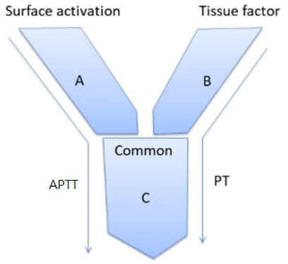 61.凝血檢測如圖示,A 區塊是僅為 APTT 檢測之凝血因子,B 區塊是僅為 PT 檢測之凝血因子,而 C 區塊是同時被 PT 與 APTT 檢測的凝血因子。第五凝血因子與第八凝血因子分別在何區塊?