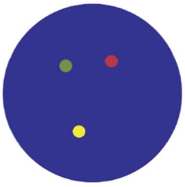 72.以 break-apart probes(分別帶有紅色與綠色螢光)進行染色體的原位螢光雜交法(FISH),發現 99%之細 胞的螢光訊號如圖所示,下列何種判讀最適當?