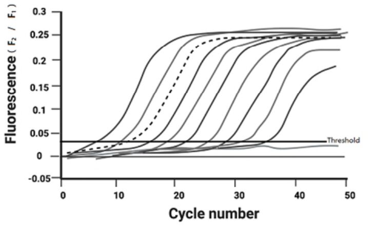 73.qPCR 技術可應用於染色體易位造成的 fusion transcript 的絕對定量,如圖實線是連續 10 倍稀釋 100 ~109 copies 的 BCR-ABL1 fusion transcript 標準品的擴增曲線,虛線則為 CML 病人檢體進行 qPCR 後的擴增曲 線。此檢體中 BCR-ABL1 fusion transcript 的含量為何?