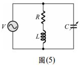 4. 如圖(5) 所示 RLC 串並聯電路,若 R=18Ω,XL=9 Ω,V=110V,若調整可變電容使電路達到諧振時,試求品質因數 Q 為多少?
