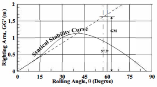 24. 靜穩度曲線(Statical Stability Curve)表示船舶在特定的裝載情況下,扶正力臂(Righting Arm) 與橫傾角之間的關係曲線(如下圖所示)。當橫傾角很小時,靜穩度曲線呈直線。該直線斜率即為定傾高GM值,其對應的橫座標值恰為多少度?