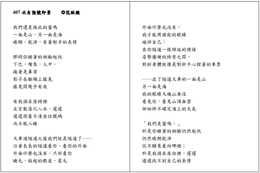 【第四題】下列是高中生的新詩作品〈407 次自強號即景〉,請試著從立意取材、意象語言、音樂性、寫作技巧……,結合對高中學生生命經驗的理解來賞析本詩,並提出修改建議。