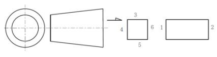 210. 工件夾持於虎鉗作端銑與側銑的情況下,將兩端面平行的圓錐形工件,銑成具有 24 個直角的六面體,如下圖所示,應如何安排各面的銑削順序?