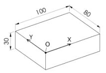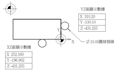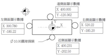245. 如下圖所示,程式原點位於工件頂面正中央,以光電尋邊器尋找程式原點,若球頭直徑為 10mm,則程式原點的機械座標為何?