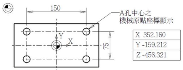 243. 機械原點與工件原點之相對位置如下圖,若測出右上 A 孔之機械座標如表所示,則工件原點之機械座標為何?