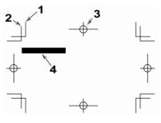 (A)1 為 Crop Mark「裁切標記」 (B)2為 Bleed「出血標記」 (C)3 為 Register Mark「對位標記」 (D)4 號色塊未作出血 。