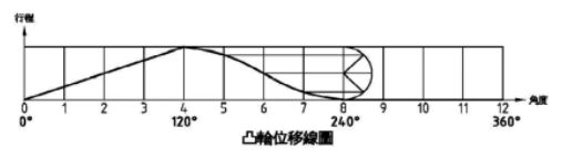 128. 下圖為凸輪之位移線圖,從動件之位移行程與凸輪軸為同工作平面,當凸輪旋轉角度 120°~240°時,從動件的行程運動為