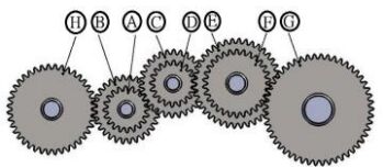 圖示為複式輪系,當 A 輪順時針旋轉時,下列何者正確? (A)C 輪逆時針旋轉 (B)E 輪順時針旋轉 (C)G 輪順時針旋轉 (D)H 輪順時針旋轉 。