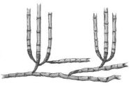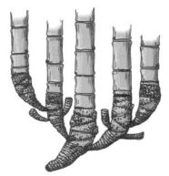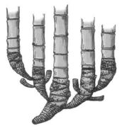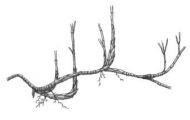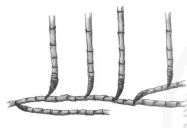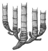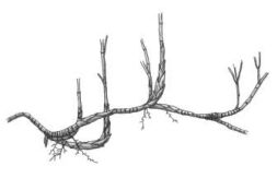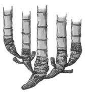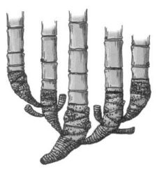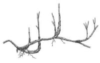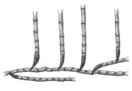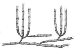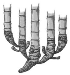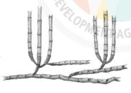 (A)合軸叢生型地下莖 (B)莖脛走出合軸叢生型地下莖 (C)橫走側出合軸叢生型地下莖 (D)橫走側出單桿散生型地下莖 。