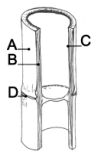 觀察竹管組織,竹管有隆起部分,圖示標示 D 為 (A)竹青 (B)竹肉 (C)竹節 (D)竹膜 。
