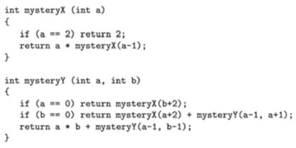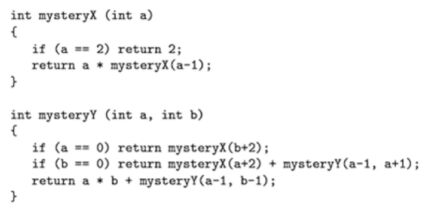 (A)mysteryY(1,0)之結果為 20 (B)mysteryY(1,0)之結果為 30 (C)mysteryY(1,0)之結果為 60 (D)mysteryY(1,0)之結果為 120 。