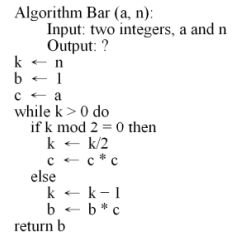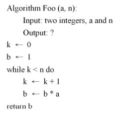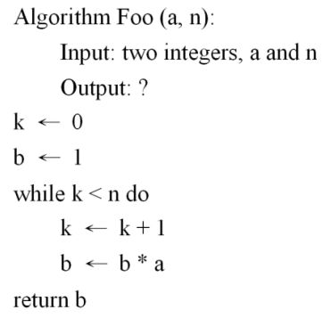 (A)演算法之功能為計算 (B)演算法之計算時間為 O(n) (C)Foo (4, 6)之結果為 4096 (D)while 迴圈內的敘述之計算時間為 O(n) 。