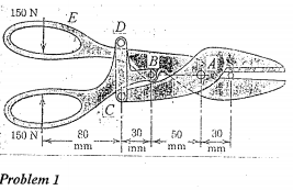 【已刪除】1. The upper blade and lower handle of the compoxmd-lever ;v shears are pin-connected to the main element ABE at A and B, respectively, and to the short link CD at C and D?、 respectively. Determine the: forces exerted on a twig when two 150N forces are applied to the handles..