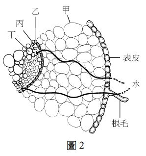 5. 圖 2 為土壤中的水分自根毛或根的表皮進入根維管 束所經過的途徑,圖中甲 → 乙 → 丙 → 丁的構造 依序為何? (A)內皮層 → 周鞘 → 韌皮部 → 木質部 (B)內皮層 → 韌皮部 → 形成層 → 木質部 (C)皮層 → 內皮層 → 形成層 → 韌皮部 (D)皮層 → 內皮層 → 周鞘 → 木質部
