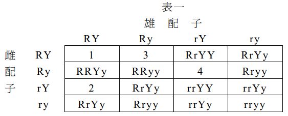 6. 表一是用棋盤方格分析兩對基因遺傳子代的基因型所得的結果,其中部分基因型並 未列出,而僅以阿拉伯數字標示。下列那一選項是錯誤的?(A)1,2,3,4 的基因型分別為 RRYY, RrYY, RRYy 和 RrYy (B)1,2,3,4 的表型都一樣 (C)在此棋盤方格中,RRYY 只出現一次 (D)在此棋盤方格中,RrYy 共出現四次 (E)基因型出現機率的大小順序為 4 > 3 > 2 > 1