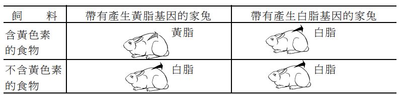 9. 家兔體內是否產生黃脂或白脂,受遺傳因素的影響。王老師選擇健康的黃脂家兔和 白脂家兔從事研究。他將兩種兔子都分成兩組,分別餵飼不同飼料:一組飼料中含 黃色素的食物;另一組的飼料中則不含黃色素的食物,結果王老師所實驗的家兔體 內產生脂質的顏色如圖 3 所示。 試問王老師的實驗結果可獲得下列何種結論? (A)家兔的脂質顏色是一種不完全顯性遺傳 (B)黃脂基因會因食物而產生突變 (C)白脂基因會因食物而產生突變 (D)白脂基因使家兔脂質顏色不受食物影響 (E)黃脂基因使家兔脂質顏色不受食物影響