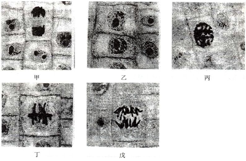 11. 下列是有關洋蔥根尖細胞進行有絲分裂的圖片,就有絲分裂過程而言,從開始到完 成之先後順序,何者正確? (A)甲→乙→丙→丁→戊 (B)乙→丙→丁→戊→甲 (C)丙→丁→戊→甲→乙 (D)丁→戊→甲→乙→丙 (E)戊→甲→乙→丙→丁