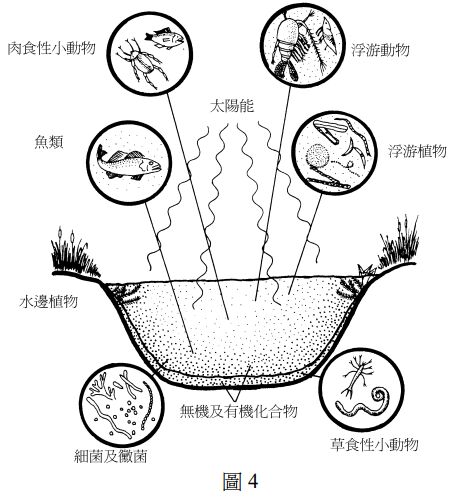 12. 圖 4 為一池塘生態系的結構示意 圖。在此生態系中的生產者為何? (A)浮游植物 (B)浮游動物 (C)細菌及黴菌 (D)食草性小動物 (E)肉食性小動物