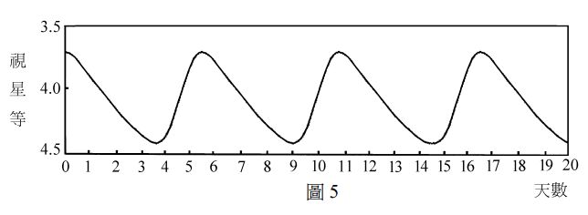 13. 天上有些恆星的亮度是會變化的,其中一種稱為造父(型)變星,本身體積會膨脹 收縮造成亮度週期性的變化。圖 5 為某一顆造父變星的亮度隨時間的週期變化圖。 依據圖 5 判斷,此一變星的亮度變化週期約為多少天? (A)2.0 (B)3.5 (C)5.5 (D)7.0 (E)20