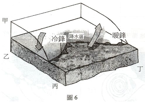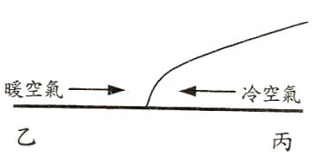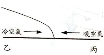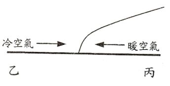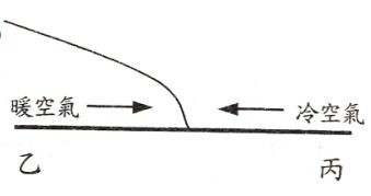 15. 圖 6 為鋒面立體模型示意圖。下列那一選項是冷鋒在甲─乙─丙縱剖面示意圖? (圖上箭頭表示空氣流動方向) (A) (B) (C) (D)